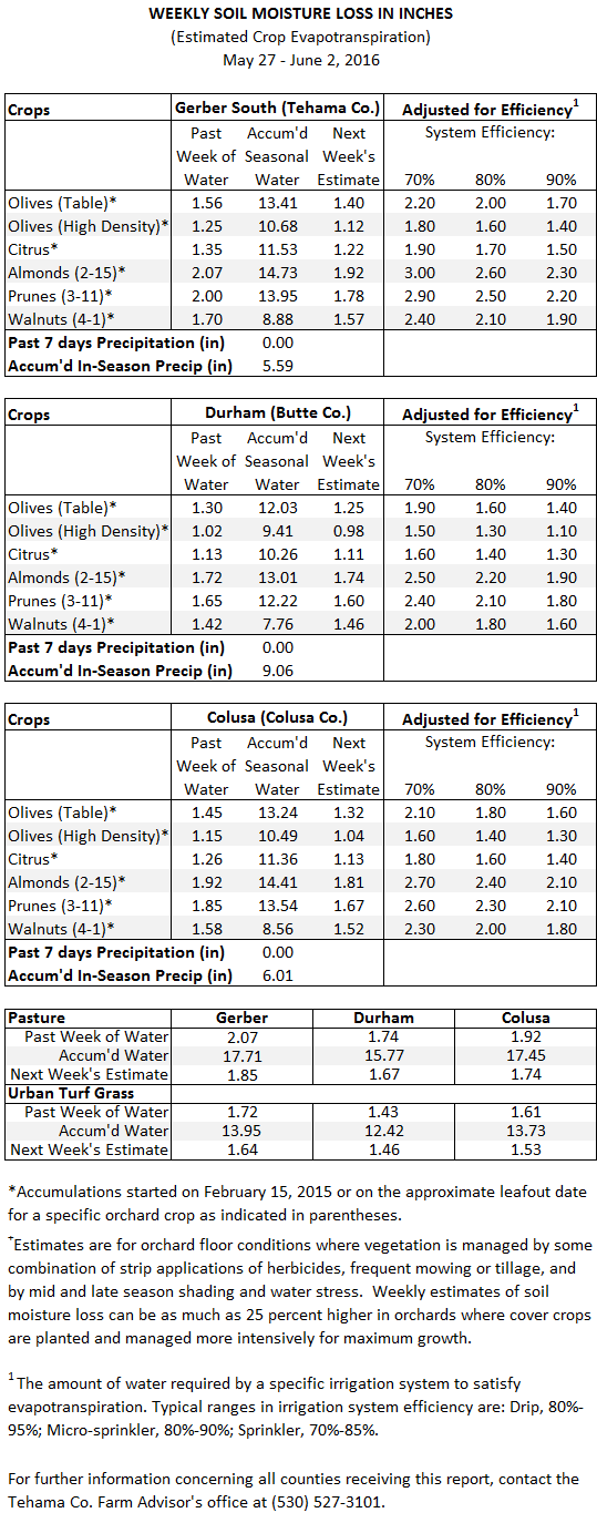 Northern Sac Valley Soil Moisture Loss Report – June 3, 2016 Home > Irrigation Mgmt > 2016 Et Reports Posted on June 6 2016 by Dani Lightle Last modified on April 11 2017