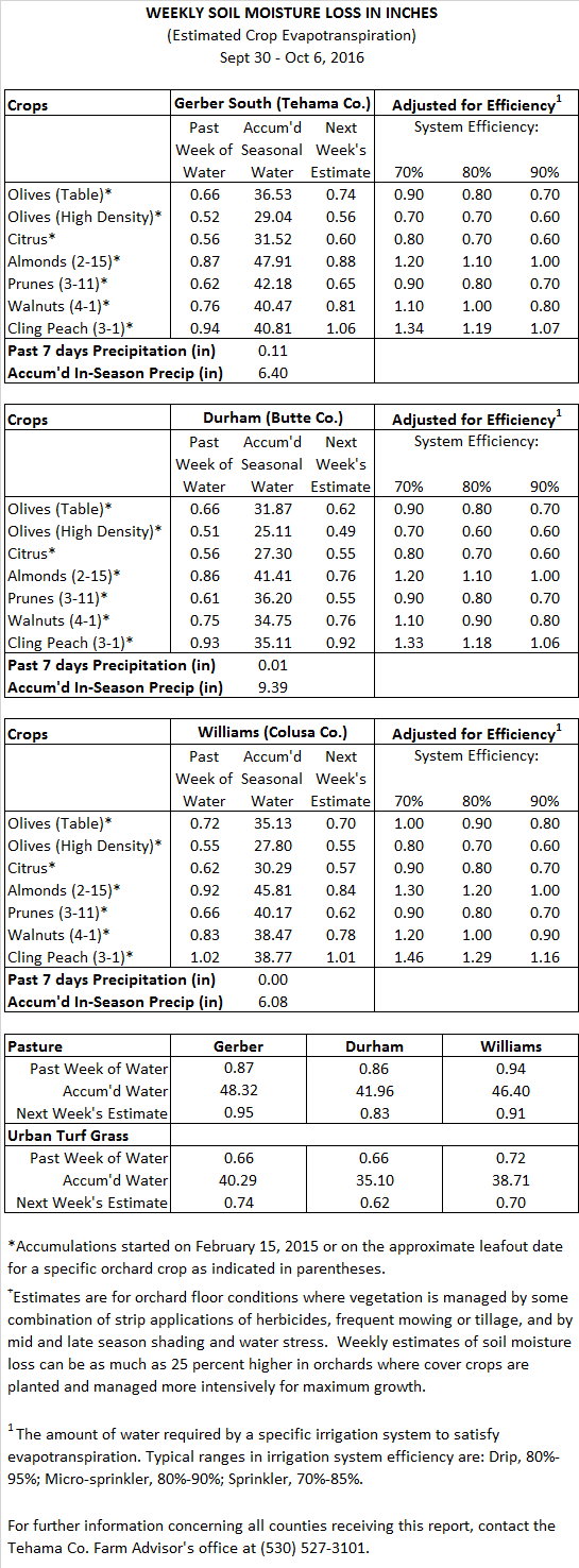 Northern Sac Valley Soil Moisture Loss Report – October 7, 2016 Home > Irrigation Mgmt > 2016 Et Reports Posted on October 7 2016 by Allan Fulton Last modified on April 11 2017