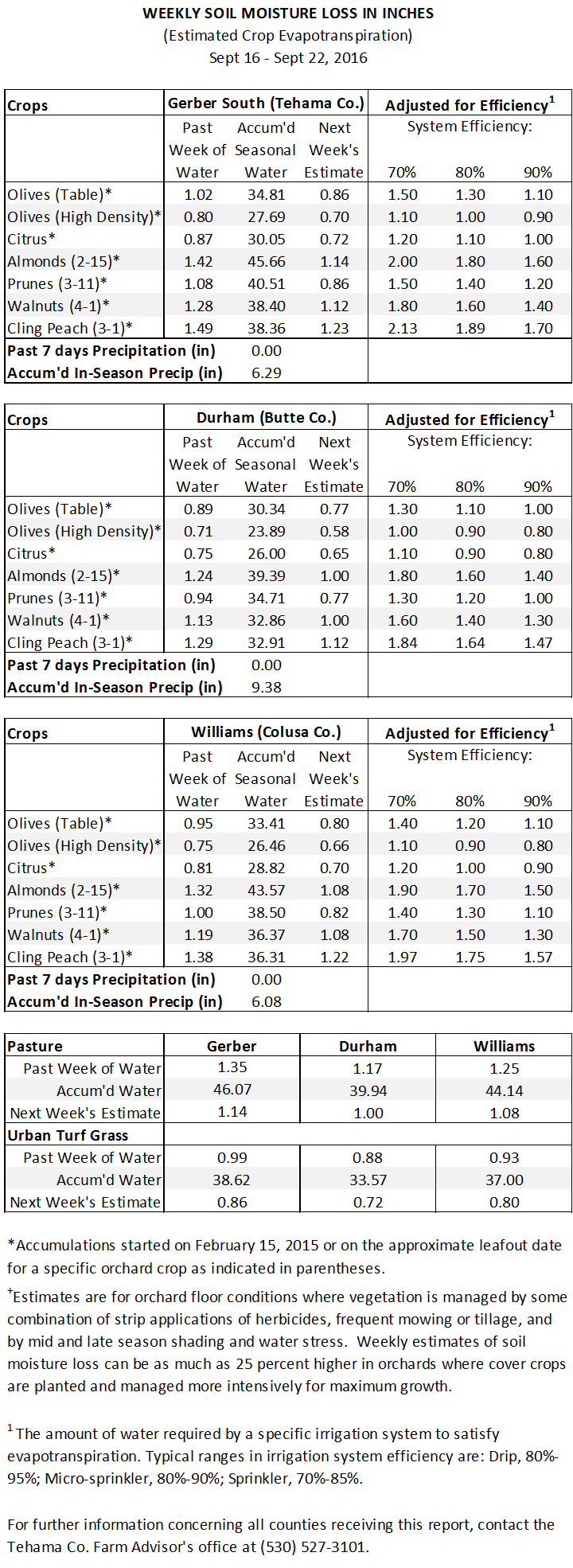 Northern Sac Valley Soil Moisture Loss Report – September 23, 2016 Home > Irrigation Mgmt > 2016 Et Reports Posted on September 23 2016 by Allan Fulton Last modified on April 11 2017