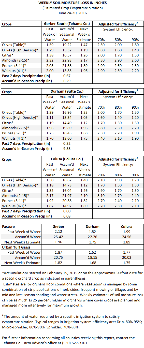 Northern Sac Valley Soil Moisture Loss Report – July 1, 2016 Home > Irrigation Mgmt > 2016 Et Reports Posted on July 1 2016 by Sacramento Valley Orchards Last modified on April 11 2017
