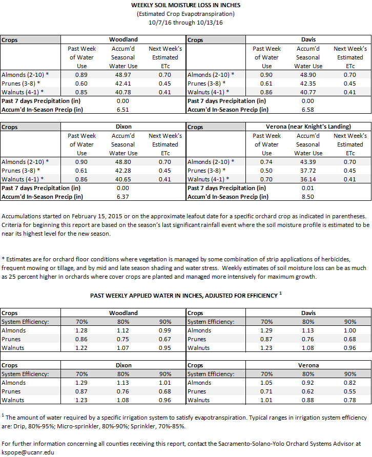 Southern Sac Valley Soil Moisture Loss Report – October 13, 2016 Home > Irrigation Mgmt > 2016 Et Reports Posted on October 14 2016 by Katherine Jarvis-Shean Last modified on April 11 2017