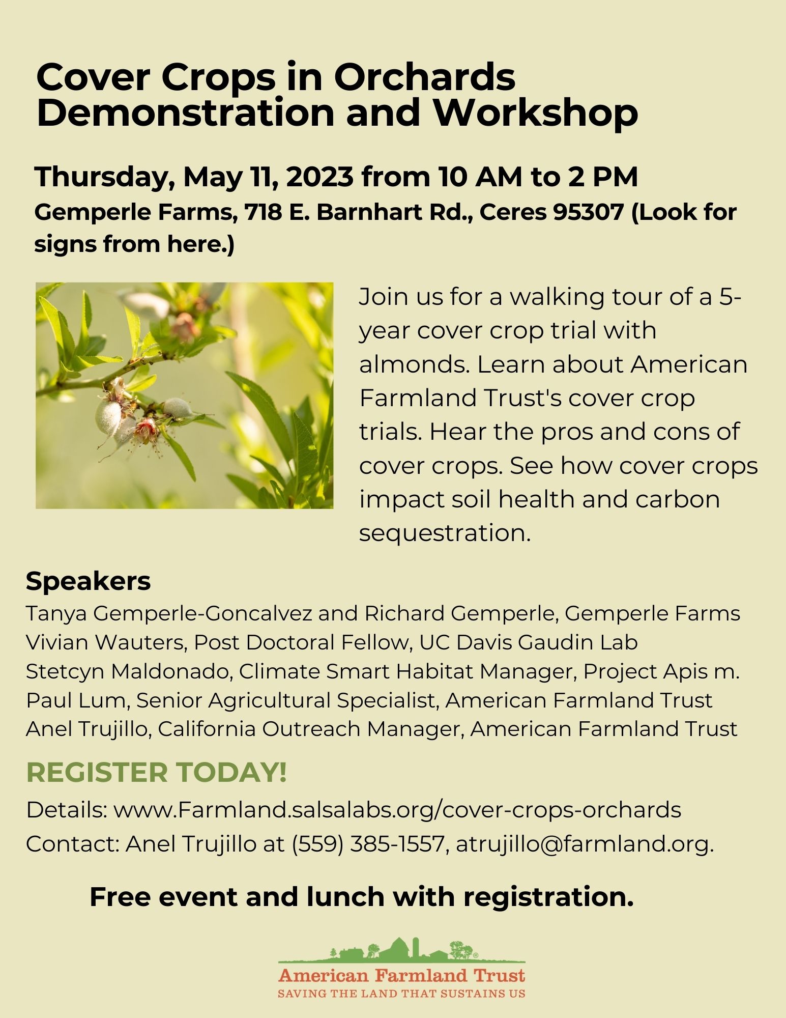 « All Events This event has passed. Cover Crops in Orchards Demonstration and Workshop May 11, 2023 @ 10:00 am - 2:00 pm « Fundamentals of Irrigation Scheduling- Orland Soil Health and Sustainability Field Day Whole Almond Orchard Recycling » Add to calendar Google Calendar iCalendar Outlook 365 Outlook Live Details Date: May 11, 2023 Time: 10:00 am - 2:00 pm Organizer Anel Trujillo Phone 559-385-1557 Venue Gemperle Farms, 718 E. Barnhard Rd., Ceres 95307 Gemperle Farms, 718 E. Barnhart Rd. Ceres, CA 95307 United States + Google Map Phone 559-385-1557