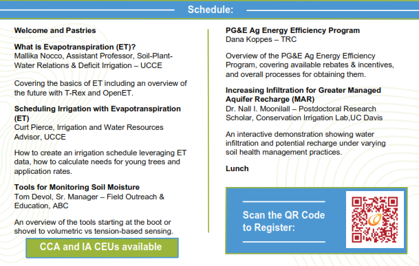 « All Events This event has passed. Fundamentals of Irrigation Scheduling- Orland April 20, 2023 @ 8:30 am - 1:00 pm « UCCE Southern Sacramento Valley Walnut Meeting- 2023 Cover Crops in Orchards Demonstration and Workshop » Co-Hosted by Almond Board of California and UC Cooperative Extension Add to calendar Google Calendar iCalendar Outlook 365 Outlook Live Details Date: April 20, 2023 Time: 8:30 am - 1:00 pm Website: https://forms.office.com/Pages/ResponsePage.aspx?id=HeREsweGNEO6AB7Juacr-hrHIoXOus9LnpywfzGZNgVUN09FTjQzU1RLOURXSVUzWVVMSUM5SjlKSy4u Venue 131 E. Walker Street, Bldg 4 131 E. Walker Street, Bldg 4 Orland, CA 95963 + Google Map