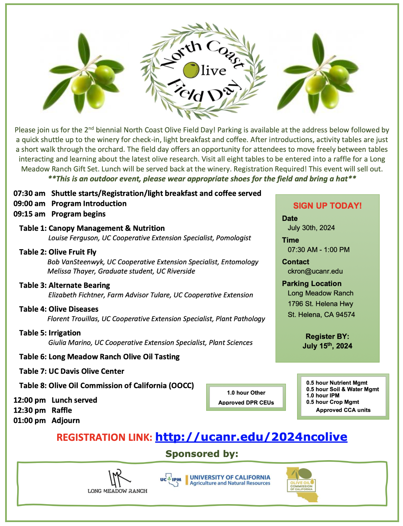 Please join for the 2nd biennial North Coast Olive Field Day at Long Meadow Ranch! Registration is required and will close on July 23