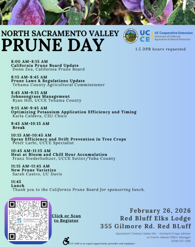 « All Events This event has passed. North Sac Valley Prune Day February 26 @ 8:00 am - 1:00 pm « South Sacramento Valley Prune Meeting Fourth Friday: Things from the Field- Red Leaf Blotch in Almonds » Save the date and join us for the North Sac Valley Prune Day! REGISTER HERE OR USE QR CODE BELOW Add to calendar Google Calendar iCalendar Outlook 365 Outlook Live Details Date: February 26 Time: 8:00 am - 1:00 pm Event Category: Prune Website: https://surveys.ucanr.edu/survey.cfm?surveynumber=41992 Organizer Jaime Ott Venue Red Bluff Elks Lodge 355 Gilmore Road Red Bluff, CA 96080 United States + Google Map