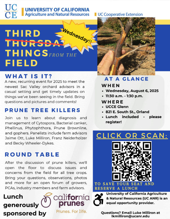 « All Events This event has passed. Third Wednesday: Things from the Field – Prune Tree Killers August 6 @ 11:30 am - 1:00 pm « Walnut Field Day – Whole Orchard Recycling & Rootstock Demo UC Davis Prune Breeding Summer Field Meeting » Add to calendar Google Calendar iCalendar Outlook 365 Outlook Live Details Date: August 6 Time: 11:30 am - 1:00 pm Event Category: Prune Website: https://surveys.ucanr.edu/survey.cfm?surveynumber=46539 Organizer Luke Milliron Phone 530-538-7201 Email lkmilliron AT ucanr.edu Venue UCCE Glenn County, E. South St Orland 821 E. South Street Orland, 95963 United States