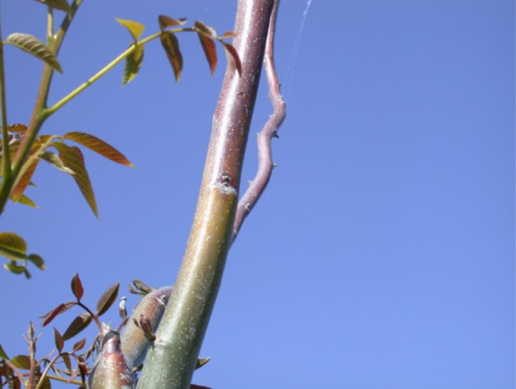 Purple-ish colored branches are indicative of winter sunburn following autumn freeze damage. Photo: J. Hasey.