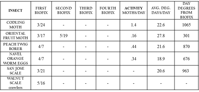 - Notice the male Codling moth biofix of 3/24/16. Our in- orchard weather stations show a 1065 Degree day accumulation. The next event should be the second flight at about 1060 DD or anytime now.