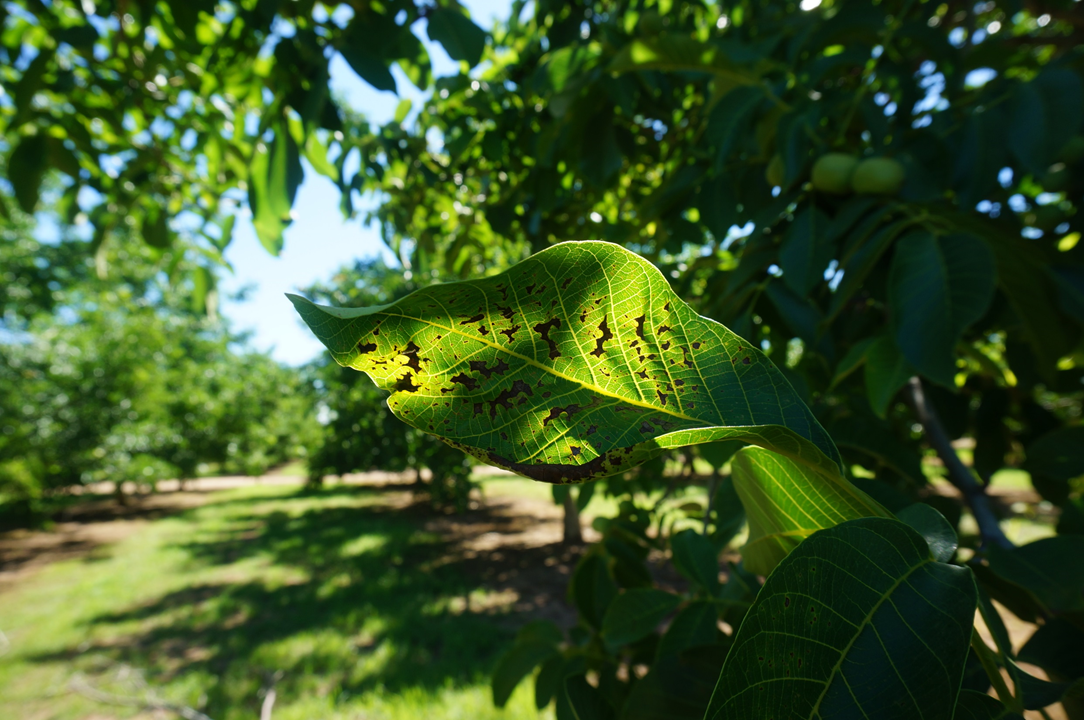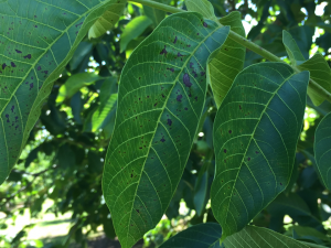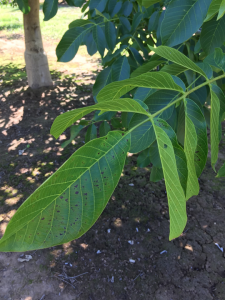 We have been seeing walnut leaves showing browning (necrosis) on the leaf area between the veins (photos 1-4) in some orchards since about mid-May. Sometimes the leaves will then twist and defoliate in very severe situations (photo 2). We call this problem mesophyll collapse and believe it is a physiological problem associated with sudden temperature changes, i.e. heat following cold or vice versa. At the Verona CIMIS station, from around May 10-13, daytime temperatures were in 80’s with a high of 91.5°F, followed by daytime maximum temperatures only reaching the 60’s from May 15 -21. May 22-25 temperatures were back up in the 70’s, down to 63°F on May 26, then back up in the 80’s.