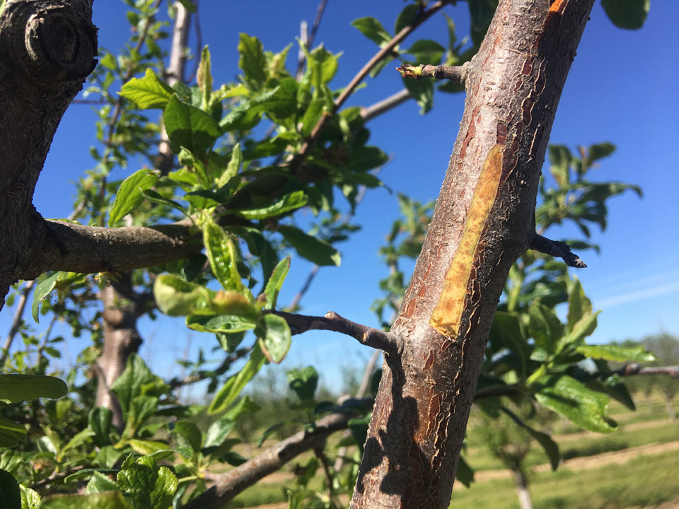 Photo 3. Classic mottled damage often associated with bacterial canker infections (photo: Franz Niederholzer).
