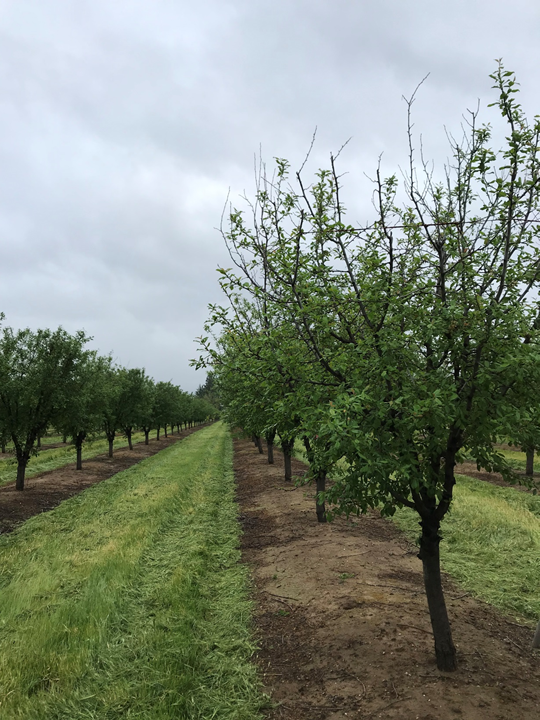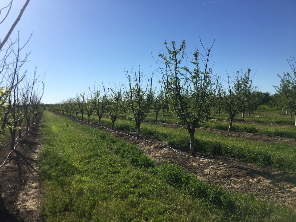 Photo 1. The block on the left had extensive limb dieback this spring. One of the differences in management between the two blocks is that the one on the right was treated for nematodes, ring nematode is a predisposing stressor for bacterial canker infections (photos: Franz Niederholzer).
