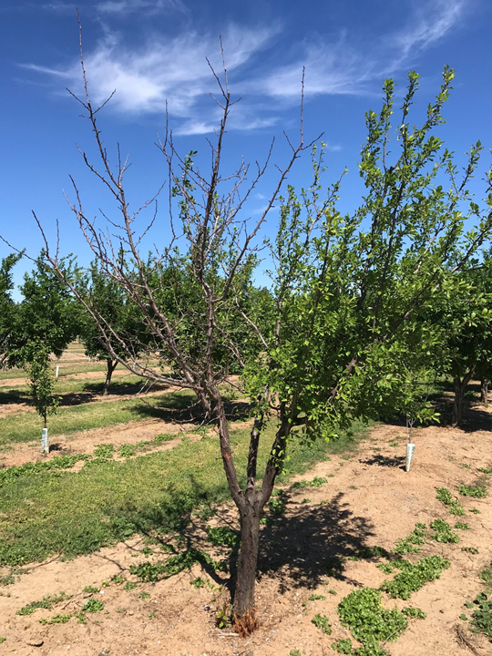 Photo 7. One edge tree in the orchard also showed the classic bacterial canker symptoms of extensive dieback with rough bark cankers (photo: Luke Milliron).