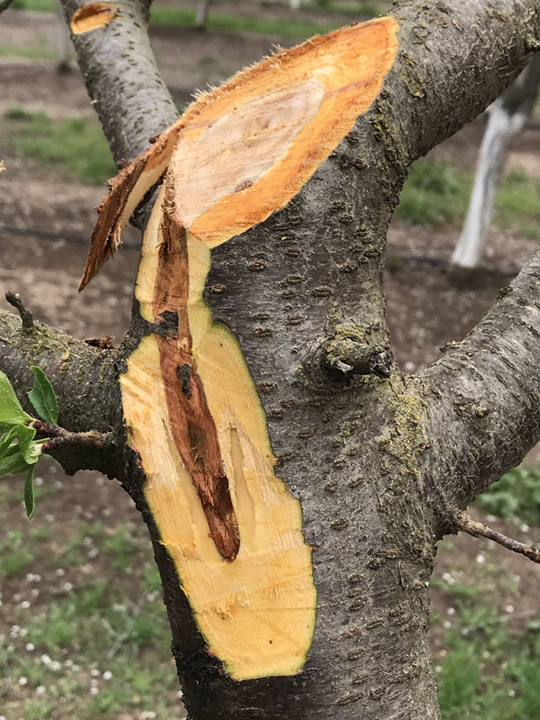 Photo 12. Cutting back one tree to see how extensive the canker damage had spread showed that damage continued to grow down to a primary scaffold. Photo: Luke Milliron.