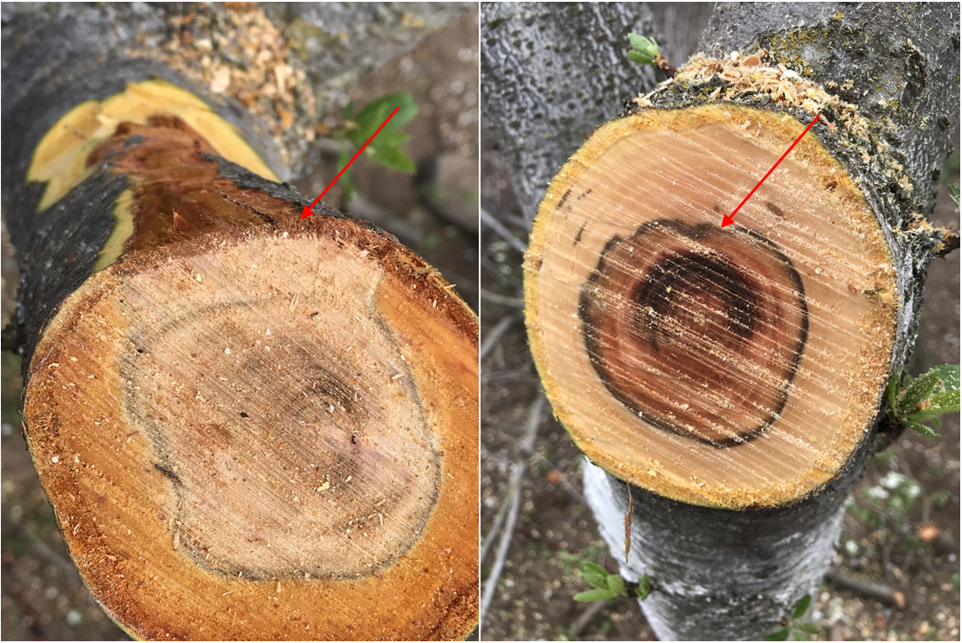 Photo 13. Cut branches showed the classic bark canker margin of Cytospora and other bark cankers (see red arrow, left photo). There was also internal dead tissue that was not spreading along the bark (red arrow, right photo); this was presumed to be Phellinus (i.e. heart rot). However, the diseased wood came back with 100% Cytospora. This was the first time that Michailides had seen Cytospora as a canker internal to the bark (photos: Luke Milliron).