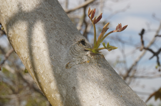 Photo 8. On otherwise blank branches, some adventitious buds are beginning to push. These buds are held in reserve on trees to allow for regrowth following dieback and other severe stressors (photo Luke Milliron). Click to enlarge.