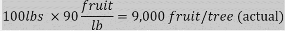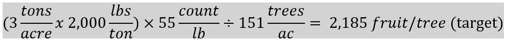 Step 1. Estimate the targeted tonnage from a given block by considering orchard history, age, etc. Let us assume a target of 3 tons/ac, and a goal of 55 dry count/lb fruit in an orchard spaced 16’ x 18’ (151 trees/acre). From there, calculate a targeted number of fruit per tree at harvest: