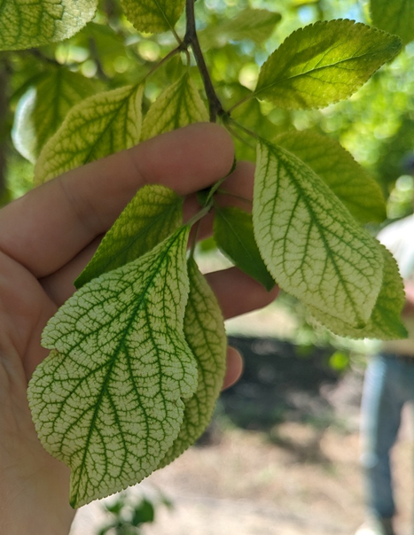 Figure 1. Interveinal chlorosis, a symptom of iron deficiency on prune leaves. These symptoms are often caused by prolonged saturated and cold soils. Photo: Jaime Ott