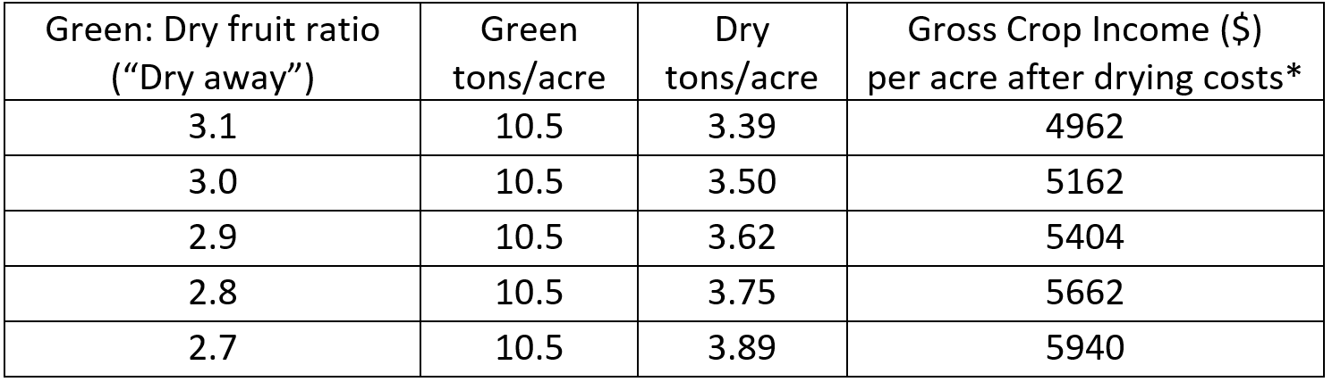 An example of the impact of dry away ratio on grower income per acre given a set quantity of fruit is delivered and dried. Assume $175/green ton drying costs and $2000/dry ton crop value.