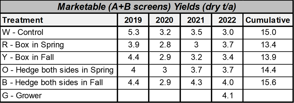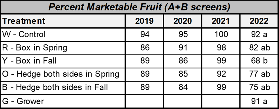 - 2021 treatment yields ranged between 3.0 and 4.1 dry ton marketable (A+B screens) yield per acre and no significant differences were found among the treatments in 2022 nor in cumulative yields (Table 1). With such large yields even after thinning, large fruit (A + B screens) comprised between 68% and 92% of the four-pound sample from all the treatments (Table 2). The Fall boxed treatment did have significantly lower percentage of marketable (A+B screen) fruit than all other treatments.