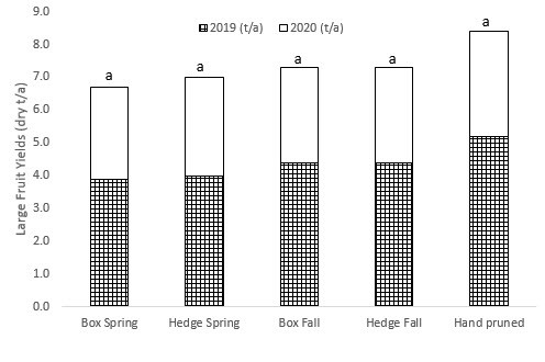 Figure 1. Dry fruit yields (A and B screens) in 2019 and 2020 in Tehama county (n =5)