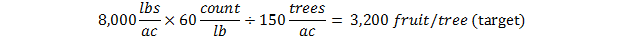 (Dry pounds per ac x Dry count per lb) ÷ Trees per ac = Target number fruit per tree