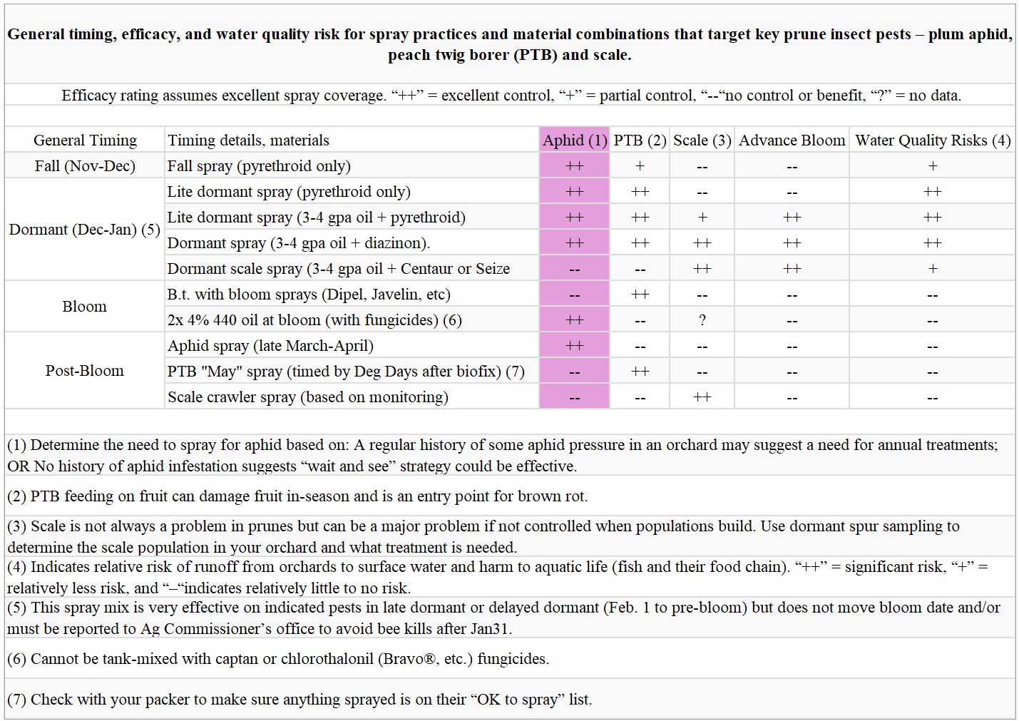 The table below (adopted from Franz Niederholzer) provides a good summary of various prune aphid control materials, their application timings, efficacy against key prune pest and risks to water quality.