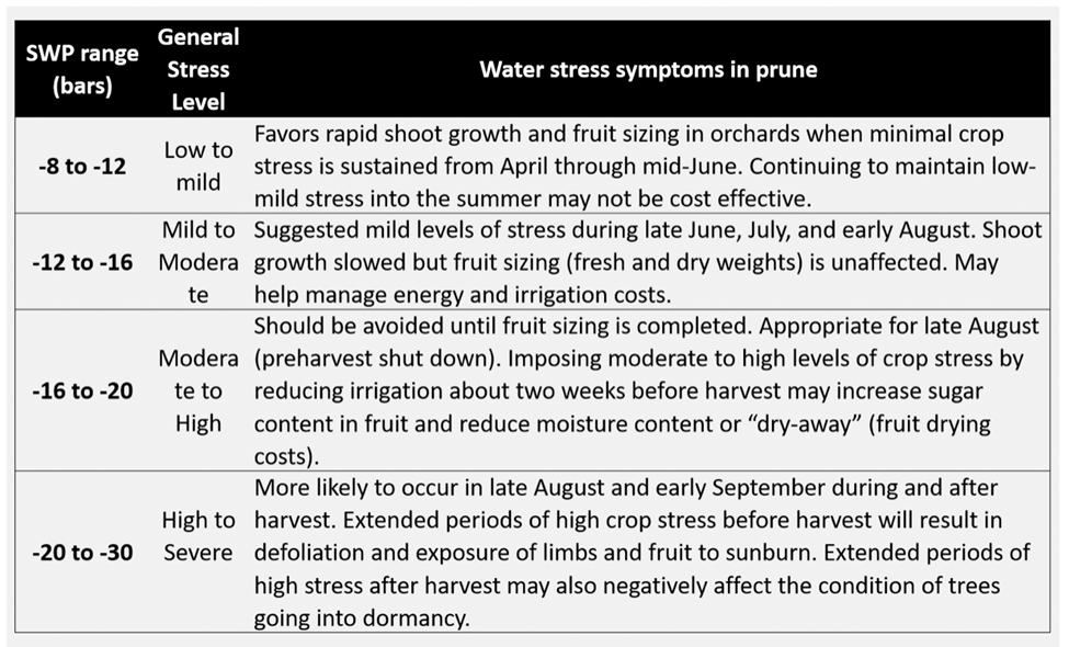 While ET and relative soil moisture are helpful for informing irrigation decisions, use of the pressure chamber is the best way to both directly measure the stress levels of trees, and account for local variations impacting different . From late June to early or mid-August, mild to moderate tree water stress levels of -12 to -15 bars allows for both sufficient support for the current crop (Table 1) and subsequent crop development while reducing overall water applied.