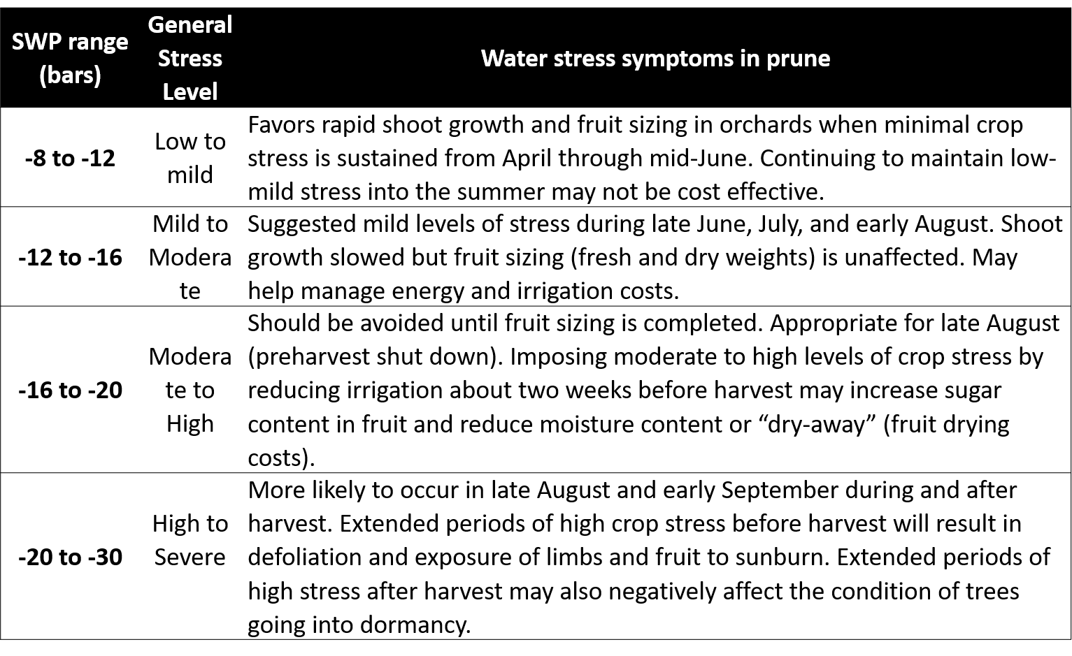 Table 1. SWP levels in prune, consideration of how SWP might compare to baseline values under various weather conditions, and the corresponding water stress symptoms to expect.