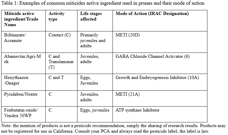 Miticides listed in the UC IPM guidelines (see Table 1 below) for prunes provide good mite control when used according to label recommendations. Most miticides are effective in contact, so good coverage of the tree canopy is critical. Miticides, which are active primarily on egg and larval stages, are usually applied before adult mite numbers build up in high numbers. Furthermore, due to concerns about resistance, miticides of a similar mode of action should not be used consecutively or more than once per year. The table below provides more information on some common miticides, their mode of action, activity type, and the life stage of mites they affect.