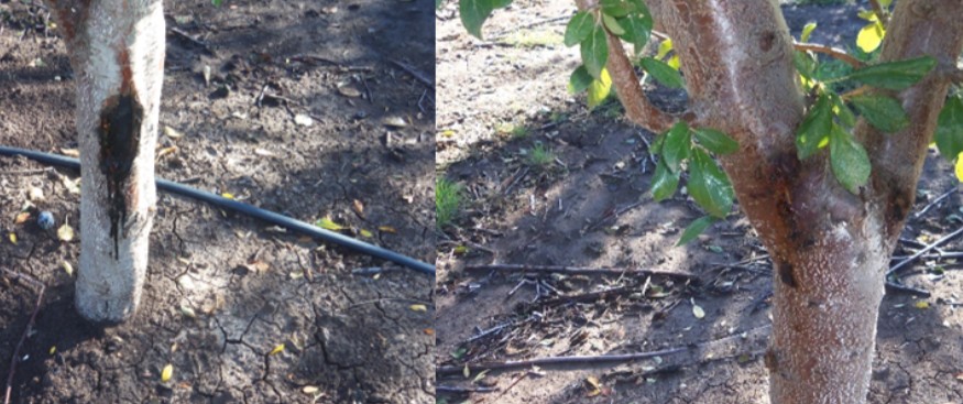 Figure 1: Cankers on the trunk (left) and crotch (right) of young prune trees. Photos by Themis Michailides.