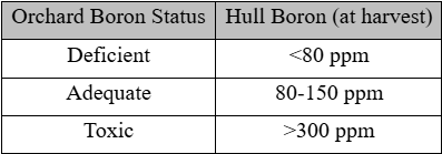 - Soil applied B and/or Zn: Postharvest soil applied B will not increase flower B levels the next spring, but it should increase hull B by next harvest. Adequate B at bloom is the goal, but both a fall foliar spray and spring-summer soil application(s) may be required if the orchard is deficient. If an orchard is B deficient (<80 ppm hull B) an in-season soil application of 2-4 lbs actual B (10-20 lb Solubor) per acre is recommended. Multiple applications instead of a single large dose should deliver best results.