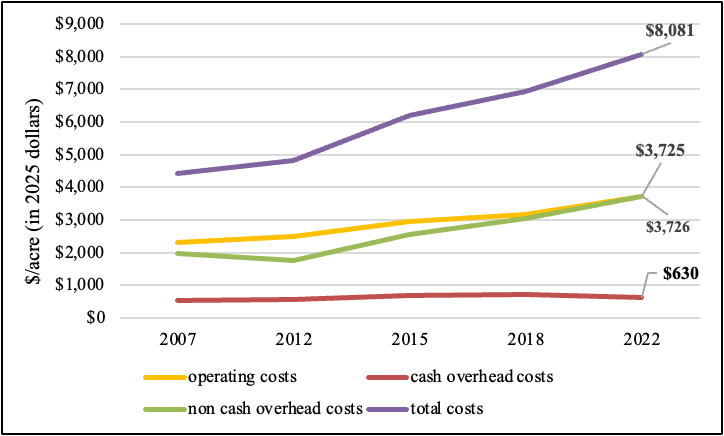 Figure 1. Per-acre costs of walnut production in the Sacramento Valley (adjusted to 2025 dollars using GDP price deflator). Source: UC ANR cost and return studies.