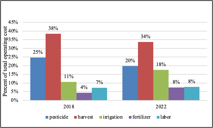 Together, irrigation, fertilizer, and labor costs accounted for 22% of total operating costs in 2018 rising to 33% in 2022. In contrast, pest management costs (herbicide, fungicide, bactericide, insecticide, and rodenticide) declined from 25% to 20% of operating costs. This shift can be attributed to several key factors. Supply disruptions following the COVID-19 outbreak, combined with the rise in U.S. natural gas prices between 2020 and 2021, significantly increased the cost of nitrogen production in the U.S., as natural gas is a key component in nitrogen fertilizer production. In addition, drought conditions between 2020 and 2022 reduced surface water deliveries and increased irrigation water pumping costs. Decrease in the overtime threshold for agricultural workers, along with the steady increase in the minimum wage (from $11 per hour in 2018 to $14 per hour in 2022), contributed to rising labor expenses. Irrigation and labor expenses are likely to continue growing as a share of operating costs in the coming years, driven by stricter groundwater management policies and labor regulations that raise labor costs. For reference, California’s minimum wage is $16.90 per hour as of January 2026, with agricultural workers entitled to 1.5 times the regular rate for overtime. Harvest costs rose about 11% between 2018 and 2022, though their share of operating costs declined from 38% to 34% over the same period.