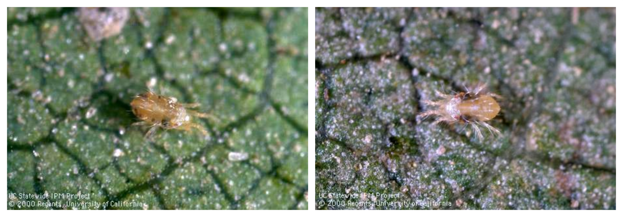 Figure 1. Pacific spider mite (left) and two-spotted spider mite are two common web-spinning spider mite pests in walnuts.