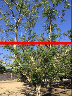 • Consider topping trees with vigorous shoot growth on lower limbs. From grower experience, these trees often recover by producing new shoot growth and it’s usually obvious within the season if a topped tree will respond and grow or not (Photo 1). In contrast, trees that have very little new shoot growth (Photo 2) often don’t survive the season after flooding so topping is unlikely to promote tree survival.
