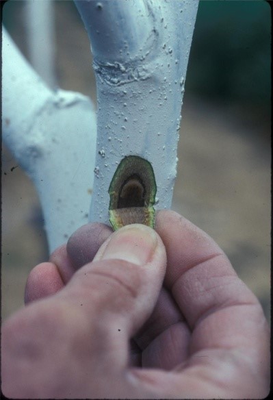 Photo 2. After a severe freeze event cut into the southwest facing trunk, looking for dark brown discoloration of the cambium (photo: Janine Hasey).