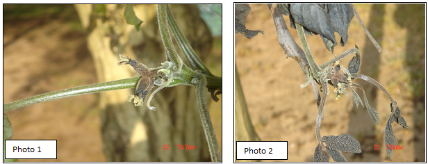 Bearing and young walnut trees suffered damage during the 2008 radiation frost event. For bearing trees, walnut flowers and small nutlets can only endure 30oF for 30 minutes without suffering damage. In 2008, sustained air temperatures below 30oF possibly occurred for as much as two hours. More frost damage was observed on walnuts that were not as leafed out, such as Howard, Chandler, Tulare and Vina compared to earlier walnut varieties like Serr that had hardened more against freezing. More leaves at the tops of the trees probably protected the lower leaves, buds, etc. from exposure to the sky.hotos 1 – 3: Frost damage on Vina walnut, April 20, 2008.