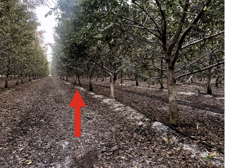 Figure 1. In Sutter Co. trial above (fall 2024), note trees 4 and 5 with a slight lean on K3 (see arrow). Tree trunks in foreground are straight. (Photo credit: Clarissa Reyes)