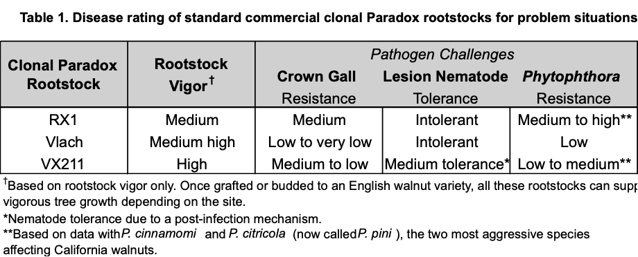 Paradox hybrid seedling: This rootstock gained popularity in the 1950s because of its vigor and tolerance to Phytophthora and lesion nematode relative to black walnut rootstock. However, Paradox seedling rootstocks are very susceptible to crown gall disease and do not possess as much resistance as RX1 clonal rootstock to Phytophthora species. There are seed sources that have lower crown gall incidence and certain nursery practices that prevent infection by the bacterium during the seed collection phase which can alleviate crown gall from developing. However, clonal Paradox rootstocks typically have much lower crown gall infection than Paradox seedling rootstocks across numerous trials statewide and have the other specific advantages shown in Table 1. Paradox seedlings also exhibit genetic variability, so tree size differences are more common than in clonal rootstock orchards.