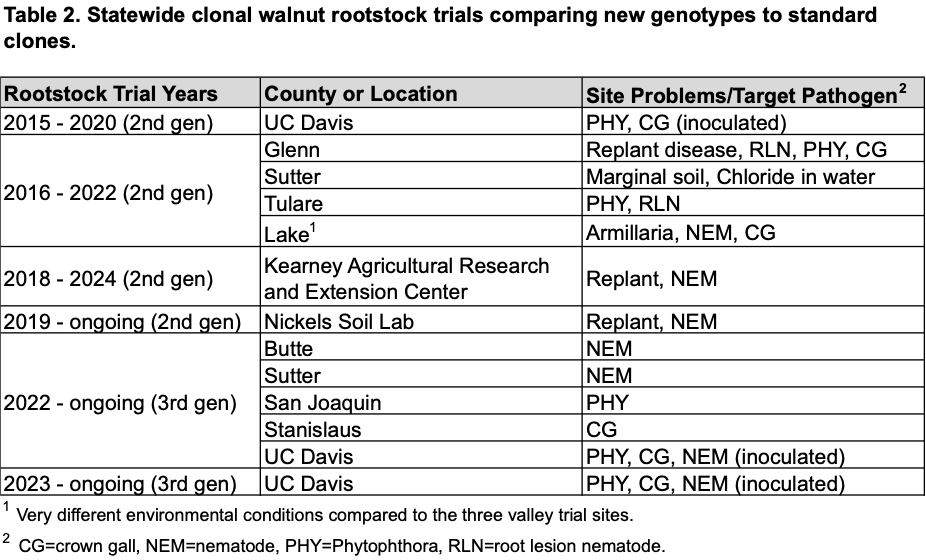 Since 2015, several replicated rootstock trials statewide have compared new experimental rootstocks to the standard clonal walnut rootstocks (RX1, Vlach, VX211) with differing soil and disease challenges. They are listed in Table 2 below and this article summarizes the most important results of the completed trials. For detailed data and results, refer to Pacific Nut Producer, December 2025, Volume 31/No.12, pp. 6-12 https://pacificnutproducer.com/2025/12/01/read-december-2025-issue/#read-december-2025-issue/6/