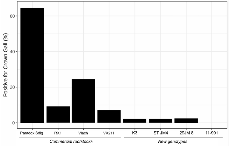 For Phytophthora crown rot, there was no incidence in RX1 and 11-991, confirming our ratings in Table 1 for RX1 and resistance to Phytophthora and in some of the new genotypes. For crown gall, experimental rootstocks K3 and 29JM 8 developed minimal disease symptoms. Crown gall symptoms on RX1 were intermediate between symptoms observed on rootstocks K3 and 29JM 8 and other industry standards Vlach and VX211. All four of the new genotypes had less crown gall severity than both Vlach and VX211, suggesting some resistance to A. tumefaciens.