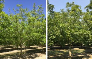- Irrigation: Keep in mind that flooded orchards are most likely dealing with a shallower, less developed root system than in previous years. Some orchards re-flooded in 2018 and/or those continuing to have a high water table created a difficult situation since root growth on surviving trees was rebounding from root death last season. Figure 5 shows the response of 2017 flood damaged 5-year-old trees that were either topped in May 2017 (trees with white trunks) vs. a less affected tree in the foreground that had little pruning. All trees were growing well but in July 2018, many trees showed scorched outer leaf symptoms indicative of too much water from overirrigating with a high water table (Fig. 6).