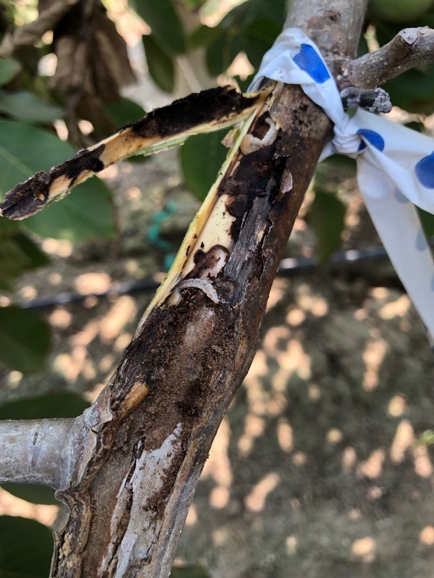 Photo 5: Infested walnut branch showing flatheaded borer larvae and feeding damage