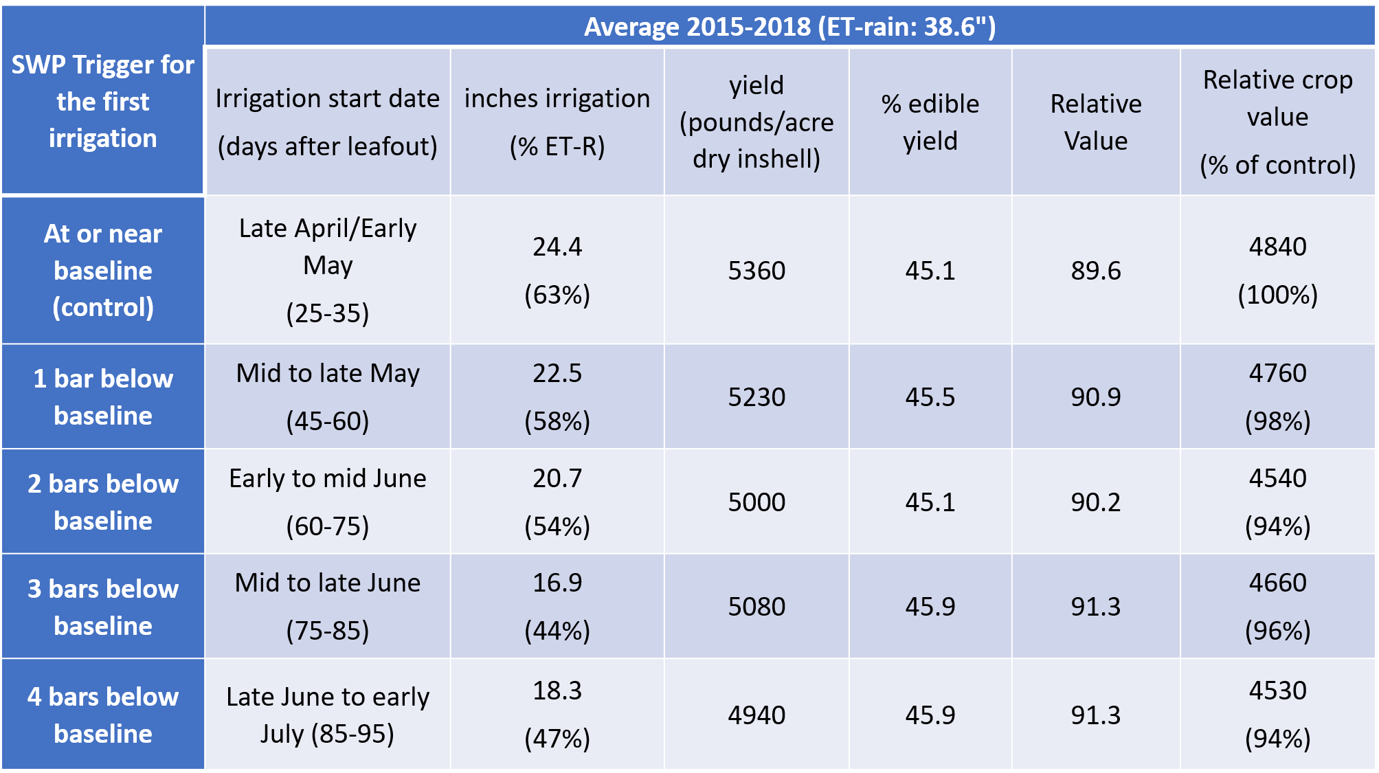 Table 3. Average irrigation start date (and equivalent days after leafout), seasonal irrigation applied in inches (and equivalent percent of the seasonal irrigation requirement, as in Table 1), yield, percent edible yield, relative value, and crop relative value (and equivalent percent of the control treatment). Relative value is an index combining the two main economic drivers of walnut value (percent edible yield and kernel color), and crop relative value is Yield x Relative value.