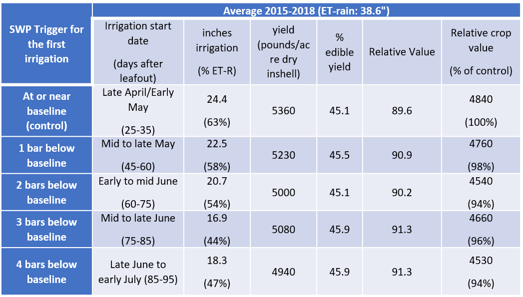 Table 3. Average irrigation start date (and equivalent days after leafout), seasonal irrigation applied in inches (and equivalent percent of the seasonal irrigation requirement, as in Table 1), yield, percent edible yield, relative value, and crop relative value (and equivalent percent of the control treatment). Relative value is an index combining the two main economic drivers of walnut value (percent edible yield and kernel color), and crop relative value is Yield x Relative value.